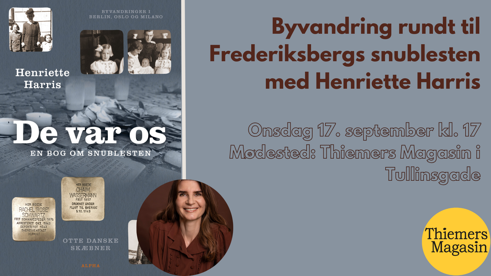 Henriette Harris er aktuel med bogen ’De var os. En bog om snublesten’ og er en af grundlæggerne af Snublesten Danmark. Det lille mindesmærke, der siden 1995 er sat for ofre for nazismen ud for deres sidste frivillige bopæl, befinder sig med 116.000 sten i 31 europæiske lande. Siden begyndelsen i Danmark i 2019 har Frederiksberg været en af kommunerne med snublesten.