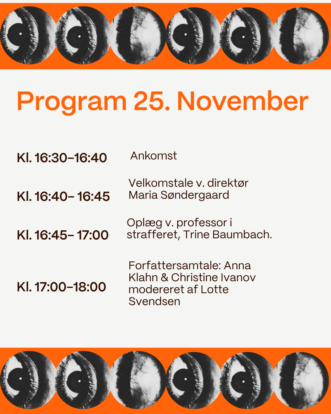 Herefter vil forfatterne Anna Klahn og Christine Ivanov samtale med instruktør og manuskriptforfatter, Lotte Svendsen. Med udgangspunkt i deres forfatterskaber vil de tale om, hvordan ord og fortællinger kan skabe forståelse, bryde tavshed, og give stemme til dem, der sjældent bliver hørt. Litteraturen vil således skabe et fælles rum for reflektion og give os nye perspektiver på partnervold og -drab.